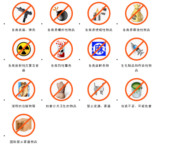 國家法律、法規、行政規章明令禁止流通、寄遞或進出境的物品,有國家秘密文件和資料、國家貨幣 偽造的貨幣和有價證券、仿真武器、管制刀具、珍貴文物(包含文房四寶等物品)、瀕危野生動物及其制品等。