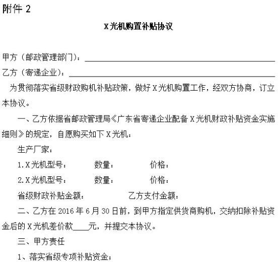 為貫徹落實省級財政購機補貼政策,做好X光快遞安檢機購置工作,經雙方協商,訂立本協議。